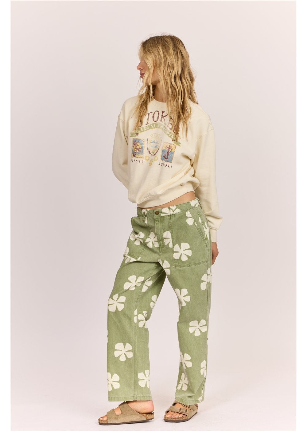 Denim straight leg pants with back darts and patch pockets. Features button and zipper closure and a logo label on one back pocket.
