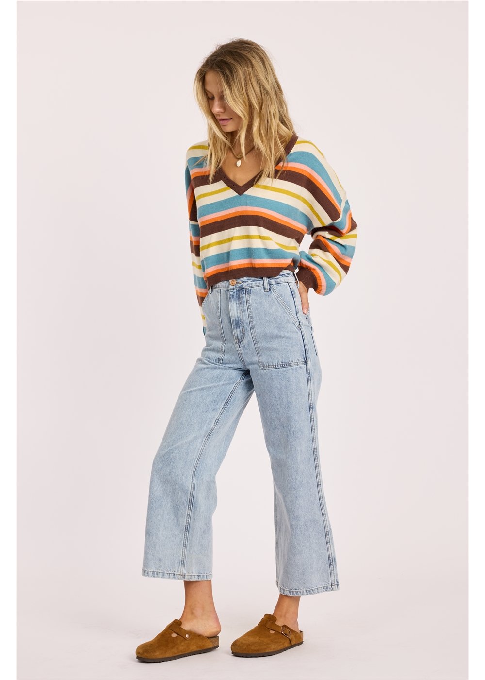 Embrace coastal charm with the By The Sea Sweater—a soft yarn dye stripe v-neck that's as relaxing as a seaside escape. The gentle stripes create visual interest without being too bold, while the luxuriously soft yarn feels incredible against your skin. The flattering v-neckline elongates and adds a touch of sophistication, and the playful balloon sleeves bring movement and personality to every wear. The cropped fit is perfectly proportioned for pairing with high-waisted bottoms or tucking into skirts, making it endlessly versatile. Whether you're layering it over a tank, wearing it solo on a breezy day, or throwing it on for a cozy night in, this sweater brings that effortless, sun-kissed energy that makes you feel like you're always just steps away from the ocean. It's the kind of piece that becomes an instant favorite in your rotation.