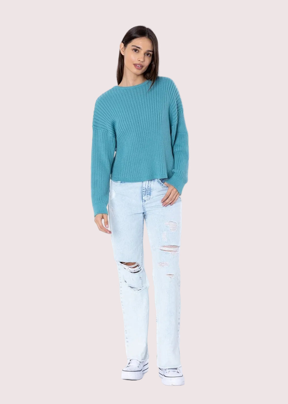 Get cozy in the oversized chucky weave sweater, complete with a low back and metal logo for an edgy touch!