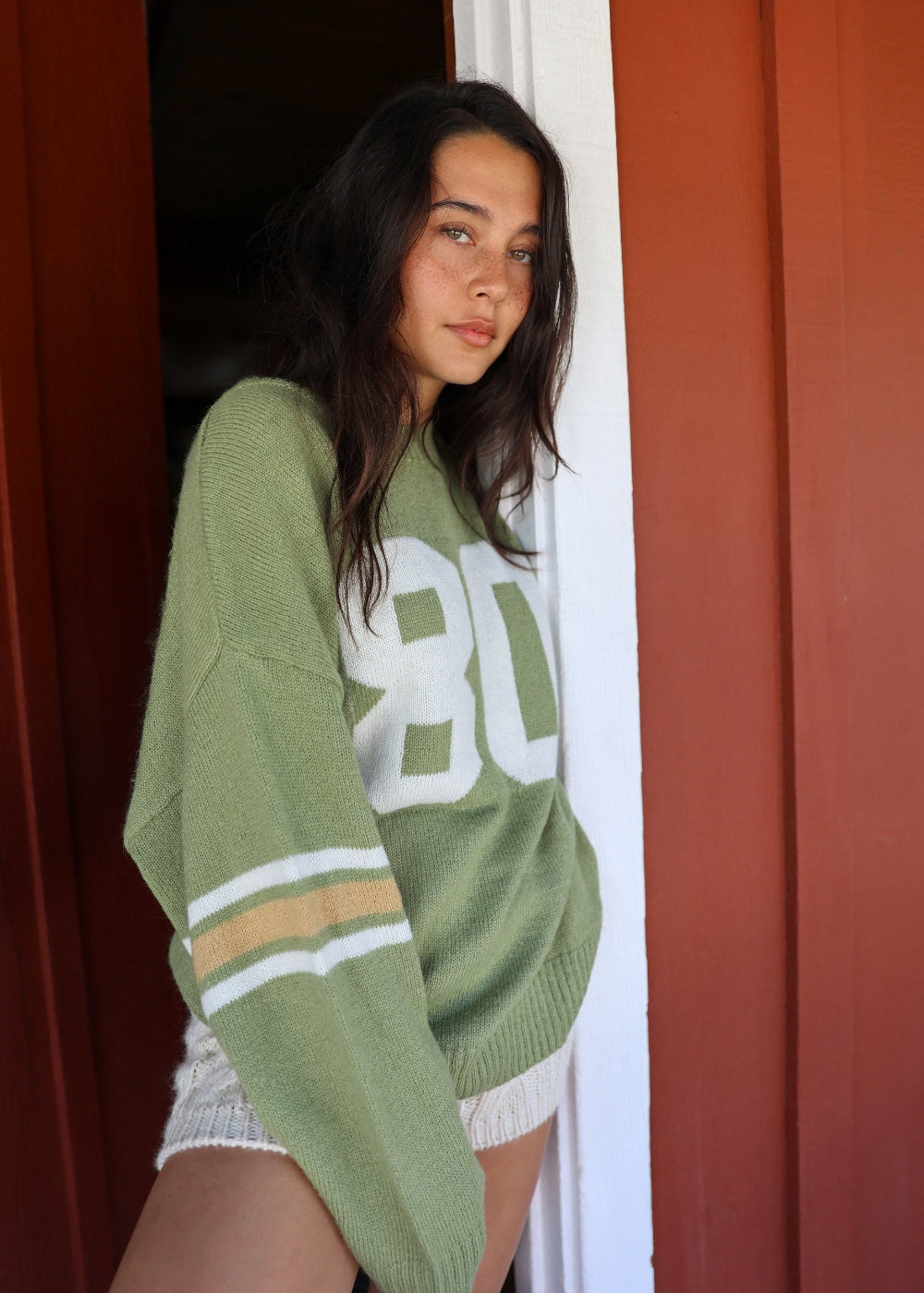 Cozy up in the Bonfire Sweater—an oversized varsity pullover that's giving major comfort-meets-style energy. The relaxed, roomy fit is perfect for those days when you want to feel wrapped in a hug, while the soft knit keeps you warm without the bulk. Ribbed sleeves and hem create a polished finish that keeps everything in place, and the front intarsia design adds visual interest and personality. Striped sleeves bring that classic varsity vibe that never goes out of style, making this sweater the perfect layering piece for fall and winter. Throw it on over a tank, pair it with your favorite jeans, or wear it solo—this is the kind of sweater that becomes an instant favorite. Whether you're gathering around a bonfire, running errands, or just want to feel effortlessly cool, this pullover delivers all the coziness you need.